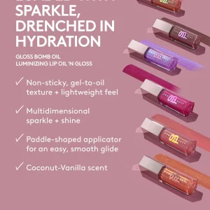 You asked. and now Gloss Bomb Oil is back—bringing you sparkle + shine in one bomb hydrating lip oil-gloss. The smooth. multidimensional shimmer goes wild on the sparkle with the lightweight feel of an oil. It’s packed with lip-loving ingredients + delivers immediate hydration. Swipe on the sparkling. good-for-you oil using the paddle-shaped applicator for a nourishing + conditioning. non-sticky feel. The sparkly. hydrating lip drip of your dreams just dropped for good this time.